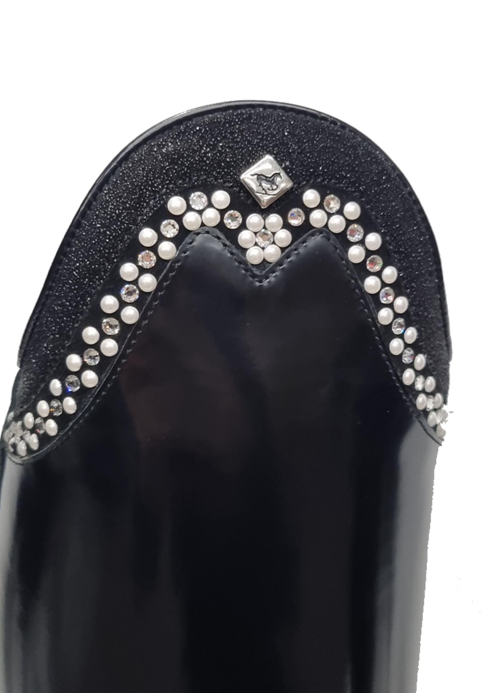 Deze prachtige Bellini laars is volledig van zwart brushed leer en samengesteld met de stardust Rondine-top met een decoratieve afwerking van white pearl cabochon en moonlight Swarovski.